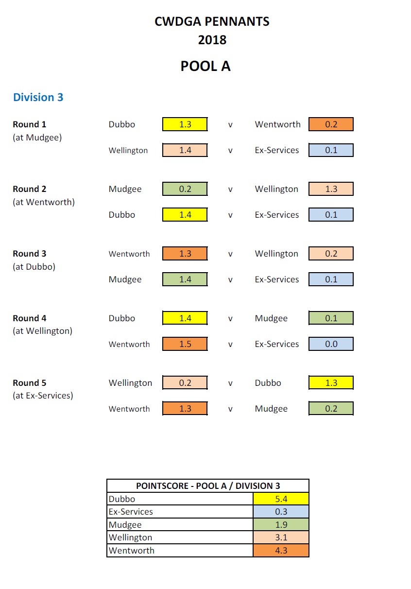 2018 CWDGA Pennants Pool A Division 3 Results
